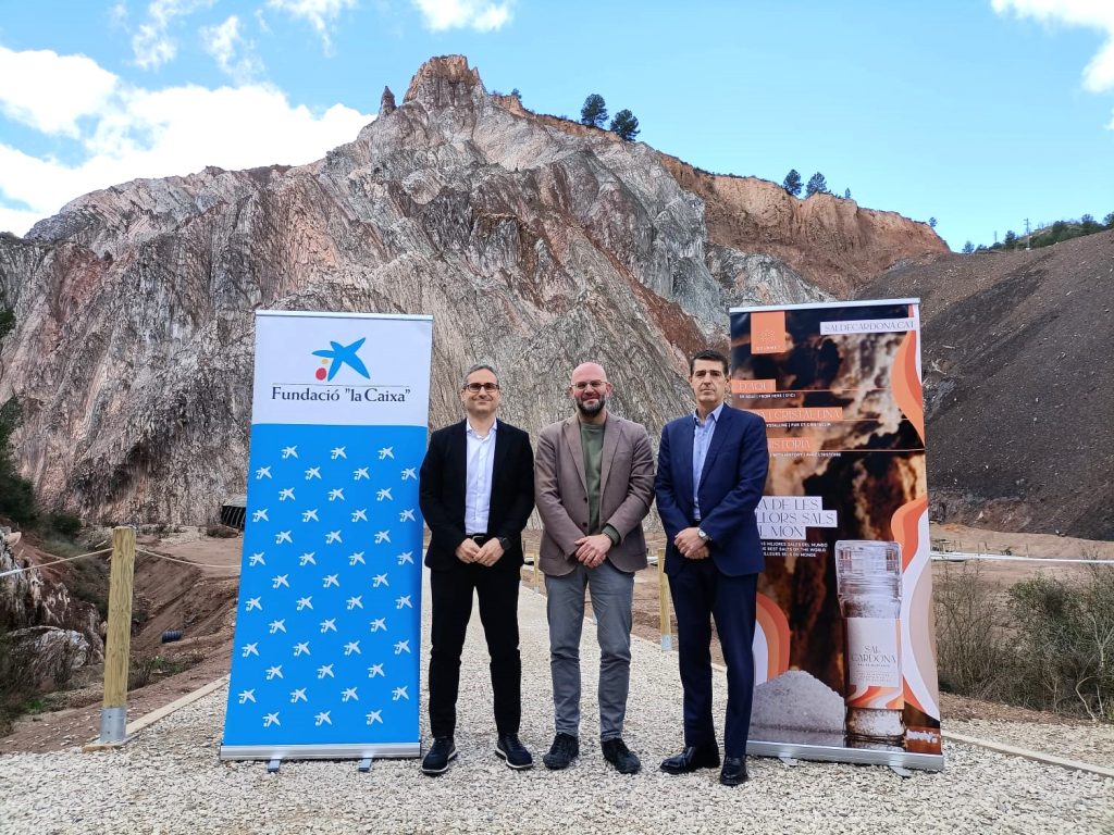El director de Banca d’Institucions de CaixaBank a Lleida, Víctor Martínez, i el director de l’oficina de CaixaBank a Cardona, Jaume Gramunt, s’han reunit amb el director general de la FCH, Francesc Ponsa, per conèixer de primera mà el projecte de la Sal de Cardona i fer efectiva la col·laboració.