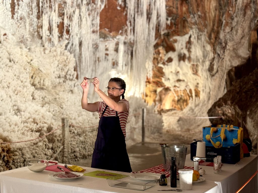 Maria Nicolau ha fet la seva demostració culinària davant una trentena de persones (l’aforament previst) reunides sota les espectaculars formacions de la Muntanya de Sal, i que amb aquest acte han obert un mes d’activitats preparades per la Fundació Cardona Històrica amb el cicle «Octubre +SAL» per posar en relleu el paisatge gastronòmic i històric de la sal de Cardona mitjançant activitats com demostracions culinàries, xerrades, presentacions i una caminada geològica.