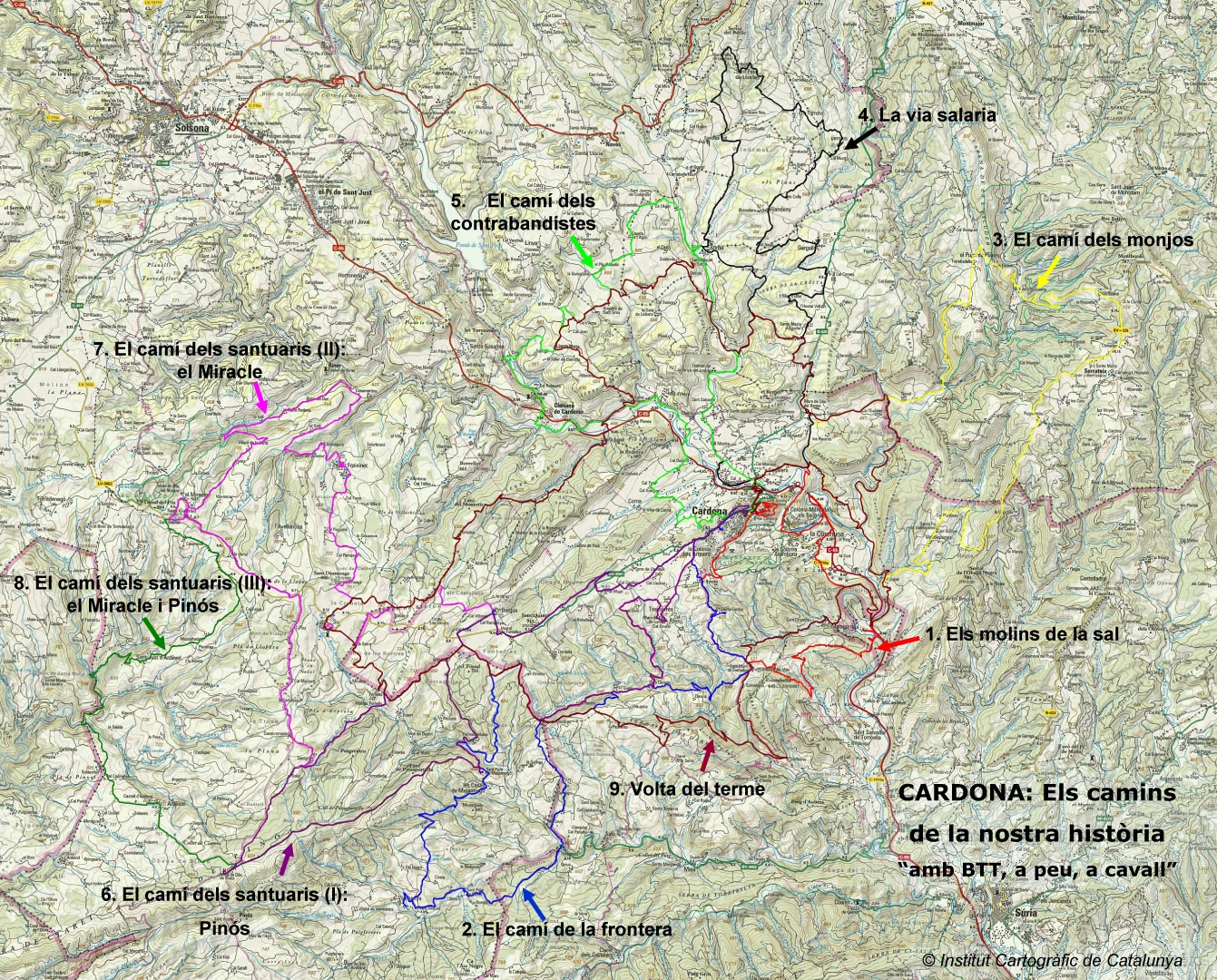 Itinerari natural, per gaudir en bicicleta de muntanya o a peu, que ens adreça als antics paratges del Baix Berguedà per on discorrien les strada Cardonensia o camins públics de Cardona, en el seu itinerari a través del terme i parròquia de l’antic monestir benedictí de Sant Maria de Serrateix. Des de la seva fundació l’any 977 pels comtes de Cerdanya, el monestir i la comunitat van tenir força lligams amb el castell de Cardona i la seva vila. Així, els monjos gaudien del dret a rebre dues càrregues de sal setmanals sobre el salí de Cardona per concessió dels seus senyors, els vescomtes de Cardona. Gaudim, doncs, d’aquests boscos de ribera on entre el silenci podrem imaginar encara la figura negra dels monjos benedictins de Serrateix al seu pas vers Cardona. Sensacional i indescriptible, cal contemplar-ho i assaborir-ho sense trencar la pau que s’hi respira.